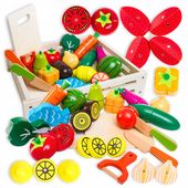 ✔️ **Bogaty zestaw elementów** - 13 różnorodnych produktów spożywczych, 2 nożyki, obieraczka, deska do krojenia oraz praktyczna skrzynka do przechowywania.