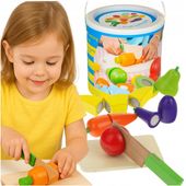 Ten wysokiej jakości drewniany zestaw do krojenia składa się z kolorowych warzyw, owoców i rybki, które można kroić bezpiecznym nożykiem i ponownie łączyć. Dzięki tej funkcjonalności dziecko rozwija precyzję ruchów, koordynację wzrokowo-ruchową oraz wyobraźnię, naśladując czynności dorosłych w kuchni.