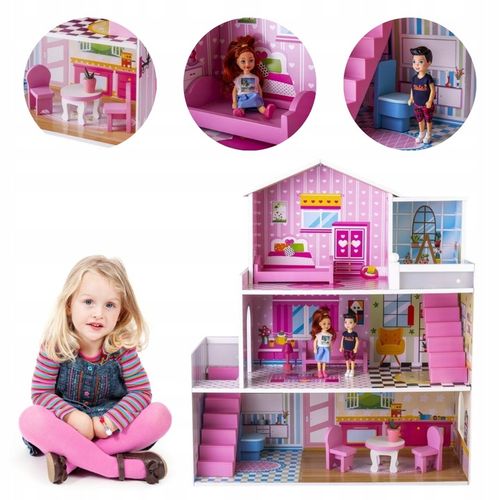 Ten pięknie wykonany drewniany domek dla lalek to nie tylko atrakcyjny wygląd, ale także ogromna dbałość o każdy detal. Trzy kondygnacje, wyposażone we wszystkie niezbędne pomieszczenia, zapewnią Twojej pociesze godziny kreatywnej zabawy.
