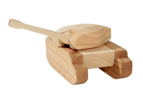 Czołg wykonany ręcznie z dużą dokładnością oraz dbałością o szczegóły. Zabawka stylizowana na czołg z okresu II Wojny Światowej typu „Tygrys”. Ruchoma wieża oraz lufa.