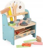 Ten wysokiej jakości drewniany warsztat dla dzieci charakteryzuje się nie tylko atrakcyjnym i ergonomicznym wyglądem, ale także bogatym wyposażeniem. Zawiera kompletny zestaw narzędzi, koła zębate, śrubki, nakrętki oraz płytki konstrukcyjne, które idealnie rozwijają umiejętności motoryczne i zapewniają najwyższy poziom zaangażowania podczas zabawy.