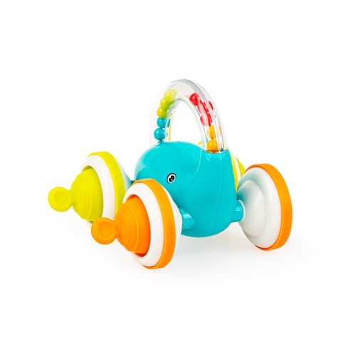 Wirując koralikami nadciąga Mobilek! Ten kolorowy słonik na czterech kółkach posiada przezroczystą trąbę, wygiętą w praktyczny uchwyt. Wewnątrz niej znajdują się koraliki, które przy prowadzeniu zwierzaka rączką, przesypują się wesoło, krążąc od słoniowej trąby, do wnętrza słonika. Koła zwierzaczka okalają miękkie obręcze, a ich środek zdobią elementy do wciskania i wyciągania, wprost idealne do ćwiczenia sprawności małych paluszków.