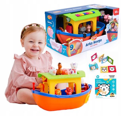 Oprócz stymulacji słuchu i wzroku, Arka Noego rozwija także motorykę małą i koordynację ruchową malucha. Wkładanie zwierzątek do właściwych miejsc ćwiczy zręczność, a rysowanie w dołączonych książeczkach trenuje sprawność manualną.