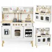 Ta wyjątkowa drewniana kuchnia XXL z interaktywnymi elementami pozwala nawet 3 dzieciom jednocześnie wcielić się w rolę małych kucharzy. Wyposażona w realistyczne efekty dźwiękowe i świetlne w mikrofalówce oraz płycie grzewczej, a także działającą kostkarkę do lodu, zapewnia autentyczne doznania podczas zabawy w gotowanie.
