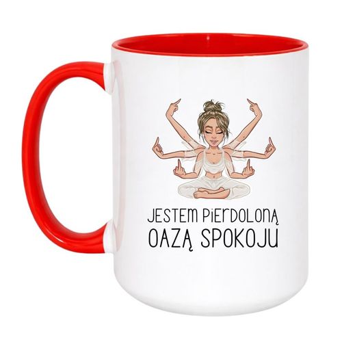 Niektórzy chodzą na jogę, niektórzy piją melisę, a Ty? Ty po prostu jesteś. Pieroloną oazą spokoju – bez filtrów, bez lukru, za to z pełnym arsenałem cierpliwości i... środkowego palca. Ten kubek z mocnym napisem i grafiką kobiety-bogini zen to perfekcyjna broń przeciwko codziennemu chaosowi. No i świetny śmieszny prezent z wulgarnym napisem dla kobiet z dystansem.