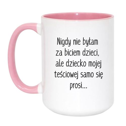 Kubek „Nigdy nie byłam za biciem dzieci, ale dziecko mojej teściowej samo się prosi” to doskonały wybór dla tych, którzy z dystansem podchodzą do relacji rodzinnych, szczególnie tych z teściami. Ten napis jest pełen humoru, który doskonale odzwierciedla sarkastyczne podejście do pewnych życiowych sytuacji. Z pewnością wywoła uśmiech na twarzy każdego, kto zna teściową i dzieci w rodzinie.