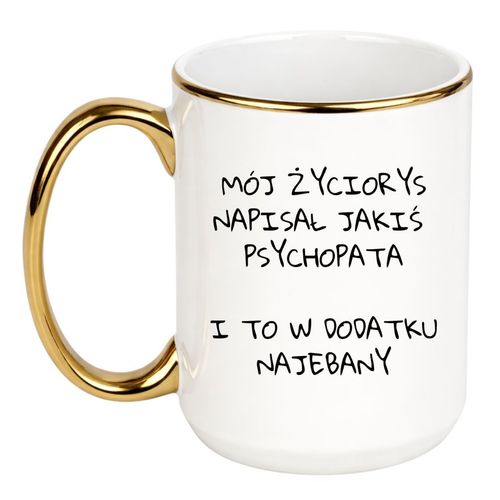 Kubek z napisem "Mój życiorys napisał jakiś psychopata i to w dodatku najebany" to: