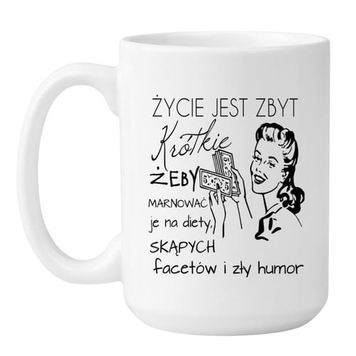 Nie licz kalorii, nie licz na skąpca i nie licz, że dziś nagle będziesz miła dla wszystkich. Kubek z napisem „Życie jest zbyt krótkie, żeby marnować je na diety, skąpych facetów i zły humor” to manifest współczesnej kobiety, która ma dość presji, oczekiwań i sałaty bez smaku. Bo kawa to nie tylko kofeina – to deklaracja, że dziś żyjesz po swojemu.