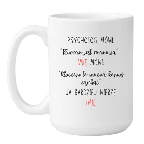 Kubek PSYCHOLOG MÓWI to najlepszy prezent dla kogoś, kto rozbraja powagę jednym zdaniem. Dla osób, które myślą szybciej niż mówią – i nie potrzebują coacha, tylko mocnej kawy.