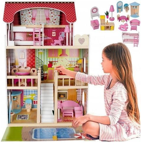 Domek posiada trzy piętra, basen, ogródek oraz balkon, co sprawia, że zabawa może przybierać różne formy i scenariusze. Dziecko może wcielać się w rolę gospodyni domowej, ogrodnika, pływaka czy po prostu bawić się w dom, rozwijając swoją kreatywność i umiejętności interpersonalne.