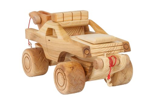Duży, drewniany model wykonany ręcznie z dokładnością i dbałością o szczegóły. Zabawka stylizowana na auto typu „Monster Truck”.