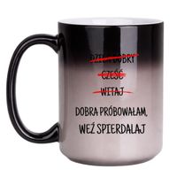 Kubek „Dzień dobry, cześć, witaj. Dobra próbowałam, weź spierdalaj.” to doskonały wybór dla osób, które nie mają czasu na udawanie, że wszystko jest ok. Jeśli poranek zaczynasz od wkurwienia i po prostu nie masz ochoty na zbędne rozmowy, ten kubek mówi za Ciebie. Idealny sposób, by jasno i dobitnie pokazać, że nie masz nastroju na nic poza swoją kawą.