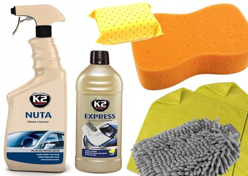 ✔️ Efektywne i wydajne środki czyszczące, takie jak szampon K2 Express i płyn do szyb Nuta, zapewniające doskonałe rezultaty.