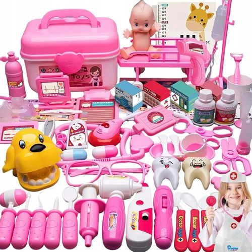 ✔️ **Kompletny strój i wyposażenie** - różowy fartuch, czepek, walizka-apteczka, lalka pacjenta i nosze z kroplówką tworzą pełne wyposażenie gabinetu.