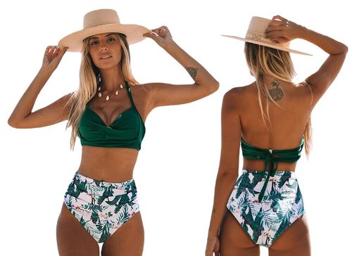 Ten najmodniejszy strój kąpielowy wyróżnia się atrakcyjnym wzornictwem, które podkreśli Twoją figurę i doda klasy. Góra w jednolitym, pięknym kolorze zielonym z odpinanymi ramiączkami i wiązaniem z tyłu, pięknie eksponuje biust. Miękkie miseczki z delikatnymi wkładkami modelują piersi, nadając im apetyczny kształt.