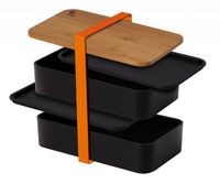 Praktyczny, dwukomorowy lunch box z kolekcji Black Rose. Wykonany z polipropylenu. W zestawie plastikowy nóż, widelec, łyżka oraz deska bambusowa będąca pokrywą. Może ona służyć jako tacka lub deska do krojenia. Pojemniki można myć w zmywarce (z wyjątkiem deski) oraz używać w mikrofalówce. Pojemniki spięte są za pomocą elastycznego silikonowego paska. Lunch box jest idealny do pracy, szkoły lub na wycieczkę.