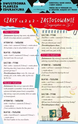 Dwustronna plansza/ściągi, wydrukowany na grubym papierze kredowym, dodatkowo pokryty folią błyszczącą. Rogi planszy są zaokrąglone.