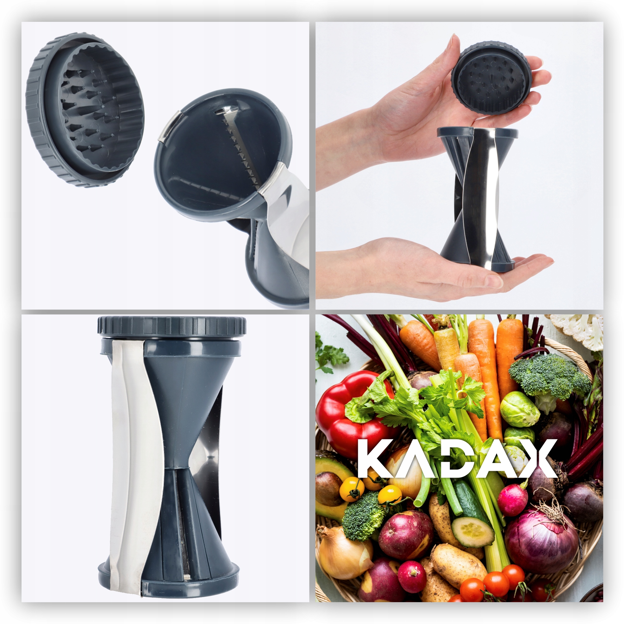 Kupując temperówkę do warzyw, kieruj się jakością. Spiralizer marki KADAX to urządzenie wykonane ze stali nierdzewnej, gwarantujące Ci długotrwałą i bezawaryjną eksploatację. Dwa ostrza, oraz łatwość w utrzymaniu czystości sprawiają, że chętnie będziesz po niego sięgać. Z kolei nowoczesna, szaro-srebrna kolorystyka spiralizera uzupełni design Twojej kuchni.