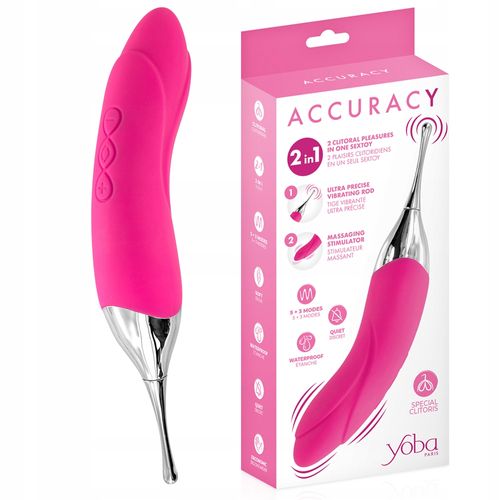 Accuracy 2in1 to poręczny, dwustronny wibrator punktowy o 5 wibracjach do precyzyjnej stymulacji najbardziej wrażliwych miejsc intymnych. Urządzenie posiada dwie możliwości stymulacji, dzięki dodatkowej końcówce waginalnej, która posiada 3 tryby wibracji, które można łatwo regulować za pomocą przycisku w środkowej części gadżetu. Ergonomiczna budowa i wąska, długa końcówka nadaje się do pieszczot łechtaczki, sutków, pochwy i anusa.