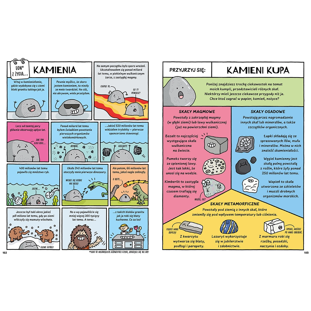 Jak wygląda dzień z życia nosa? Czy ślimaki mają zęby? Ile waży Słońce? Kolorowy i dowcipny komiks edukacyjny, który odpowie na te i wiele innych fascynujących pytań! Przeczytacie tu sekretne dzienniki między innymi takich osobistości jak pracowita wątroba, towarzyska kurzajka, odrzutowa meduza i nieobliczalne tornado. Staniecie oko w oko z gigantyczną kałamarnicą, dotrzymacie towarzystwa łazikowi marsjańskiemu i dowiecie się, jak wygląda codzienne życie wulkanu. Ani się obejrzycie, poznacie około 100 zagadnień związanych z działaniem organizmu człowieka, życiem zwierząt, pogodą, budową Ziemi i kosmosem. Znajdziecie tu zjawiska od skali mikro do makro, od tego, co przyziemne, a nawet trochę obrzydliwe (Skąd się biorą bąki? Co to są gnidy?), aż po piękne i fascynujące fenomeny przyrody (Jaką temperaturę ma lawa? Jak powstaje zorza polarna?). Zabawne historyjki, przejrzyste ilustracje i przystępny język pomogą zrozumieć nawet skomplikowane zjawiska – i obudzą apetyt na więcej! Dzień z życia skunksa, jelita i tego, kto to czyta otrzymał w 2021 roku brytyjską nagrodę Blue Peter Award dla najlepszej książki non-fiction dla dzieci.