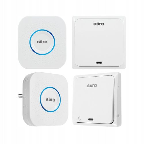 System Eura Kinetic działa w paśmie 433 MHz z zasięgiem do 100 m w terenie otwartym, gwarantując stabilną transmisję bez zakłóceń dla innych urządzeń. Podłączany bezpośrednio do gniazdka sieciowego, oferuje sygnalizację optyczną i regulację głośności do 85 dB, co pozwala na precyzyjne dostosowanie do otoczenia.