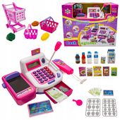✔️ **Kompletne wyposażenie sklepu** - w zestawie wózek na kółkach, koszyki, przesuwna taśma oraz bogaty asortyment produktów spożywczych.