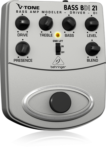 Efekt do gitary Behringer BDI21 V-Tone Bass. Ten wysokiej jakości sterownik niskotonowy został zaprojektowany dla basistów o zróżnicowanych potrzebach. Zintegrowana emulacja wzmacniacza lampowego wytwarza właściwy dźwięk, oraz reaguje na wprowadzony przez wejście mikrofonowe, basowy wzmacniacz lampowy, podczas gdy dwupasmowy korektor (z możliwością sterowania) oraz dedykowany system kontroli sterownika pozwala stworzyć każdy niskotonowy dźwięk - od klasycznego po nowoczesny. Ponadto, sterownik BDI21 działa jako standardowe, ultra-przeźroczyste urządzenie wprowadzenia bezpośredniego.