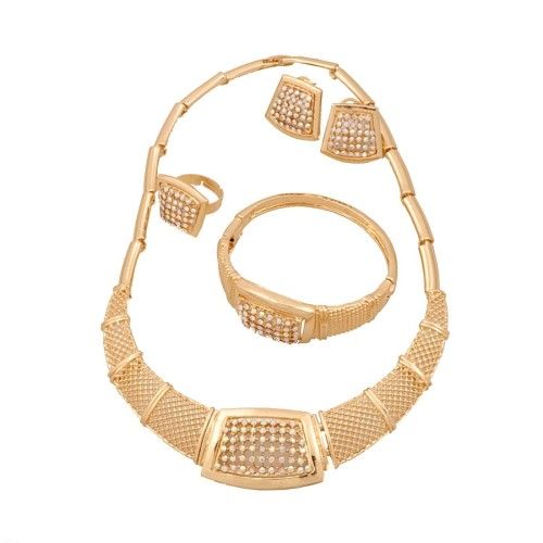 Efektowny, elegancki komplet z cyrkoniami. Naszyjnik średnica 13 cm, szerokość 0,5 - 3 cm. Bransoletka średnica 6 cm, szerokość 0,5 - 2,5 cm, Kolczyki 2,3 x 2,3 cm. Warstwa złota naniesiona w metodzie - PVD- napylanie próżniowe jonami tytanu, czy też azotkiem tytanu jest nowoczesną metodą nanoszenia powłok o bardzo dużej trwałości. * Pokryte jest w całości 4 - 8 mikronową warstwą 14K, 18K i 24K złota. * Warstwa złocenia pokryta jest lakierem jubilerskim, który zabezpiecza powłokę złota przed ścieraniem i nadaje wspaniały połysk * Biżuteria wykonana ze stali szlachetnej-należy do grupy stali o strukturze austenitycznej ( podobna chirurgiczna 316 L) : - jest hipoalergiczna i nie uczula, ponieważ nie emituje związków niklu do organizmu - nie koroduje, nie odbarwia się i długo cieszy swoim blaskiem - ścieralność uzależniona od noszenia i od pH ciała - nie wymaga specjalnej konserwacji jak biżuteria ze srebra, czy złota Ze względu na różne ustawienia monitorów oraz różną jakość wyświetlaczy zastosowanych w urządzeniach mobilnych, kolory przedstawione na zdjęciach mogą nieznacznie różnić się od rzeczywistych. Dokładamy wszelkich starań, aby na stronie Sklepu przedstawiać tylko realne zdjęcia produktów, jak najbardziej zbliżone do rzeczywistości.