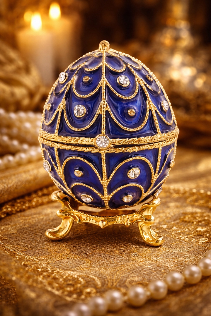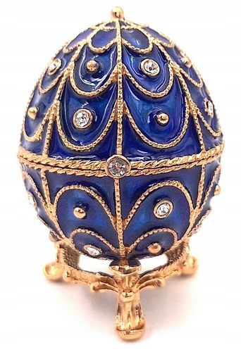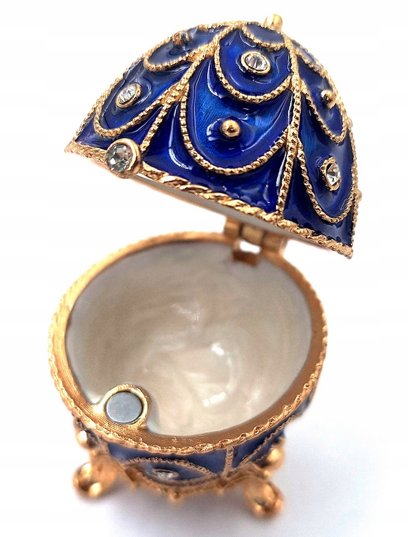 Elegancka szkatułka w kształcie jaja Fabergé to wyjątkowy przedmiot inspirowany słynnymi dziełami jubilerskimi z XIX wieku. Bogate zdobienia, intensywne kolory oraz kunszt wykonania sprawiają, że produkt przyciąga uwagę i zachwyca swoim wyglądem. To idealne miejsce do przechowywania biżuterii oraz wyjątkowy element dekoracyjny.