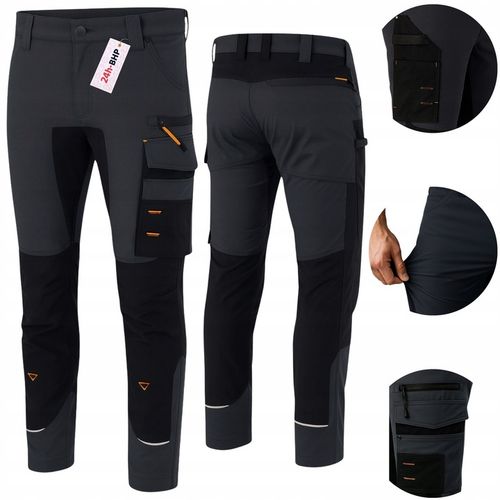 Te elastyczne spodnie robocze męskie BHP stretch w modelu grafitowo-pomarańczowym wyróżniają się zaawansowaną tkaniną 4-way stretch, która rozciąga się w czterech kierunkach, zapewniając pełną swobodę podczas intensywnej pracy. Ergonomiczny krój z podwyższonym tyłem pasa idealnie wspiera sylwetkę, oferując komfort nawet po wielu godzinach na placu budowy czy w warsztacie.