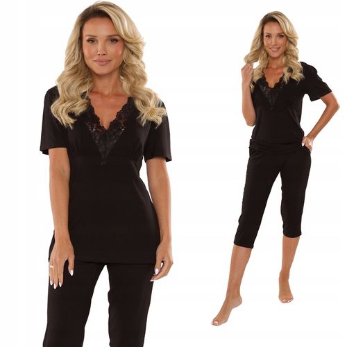 Głęboki dekolt w szpic oraz koronkowe wykończenia nadają tej piżamie wyjątkowego charakteru i podkreślają jej luksusowy styl. Spodnie długości 3/4 z kieszonkami dodają jej nutki casualowego szyku, łącząc komfort z estetyką.
