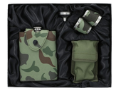Elegancki, a jednocześnie praktyczny zestaw w stylu moro – idealny na wypad w plener, biwak czy wędkowanie. W środku znajdziesz piersiówkę o pojemności 8 oz (240 ml), dwa kieliszki, lejek ułatwiający nalewanie oraz komplet sztućców turystycznych w etui. Całość spójnie wykończona i zapakowana w pudełko prezentowe, gotowe do wręczenia.