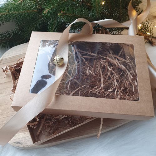 Pudełeczko z papierowym wypełniaczem przewiązane kolorystycznie pasującą do uroczystości wstążką - wybierz ciastka, dołóż do koszyka pudełeczko i ciesz się zestawem prezentowym skrojonym na miarę.