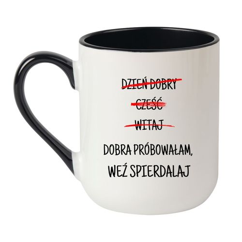 Kubek „Dzień dobry, cześć, witaj. Dobra próbowałam, weź spierdalaj.” to doskonały wybór dla osób, które nie mają czasu na udawanie, że wszystko jest ok. Jeśli poranek zaczynasz od wkurwienia i po prostu nie masz ochoty na zbędne rozmowy, ten kubek mówi za Ciebie. Idealny sposób, by jasno i dobitnie pokazać, że nie masz nastroju na nic poza swoją kawą.