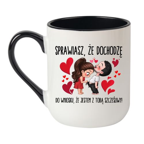 Ten kubek to mały manifest miłości w wersji codziennej. Napis „Sprawiasz, że dochodzę do wniosku, że jestem z Tobą szczęśliwy” połączony z uroczą ilustracją zakochanej pary sprawia, że każda kawa smakuje lepiej, a każdy poranek zaczyna się od uśmiechu.