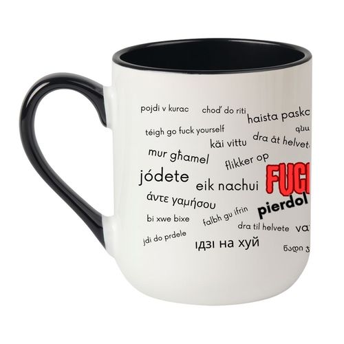 Choć przekaz jest mocny, kontekst decyduje o odbiorze. Ten kubek z napisem fuck you w różnych językach często wybierany jest jako: