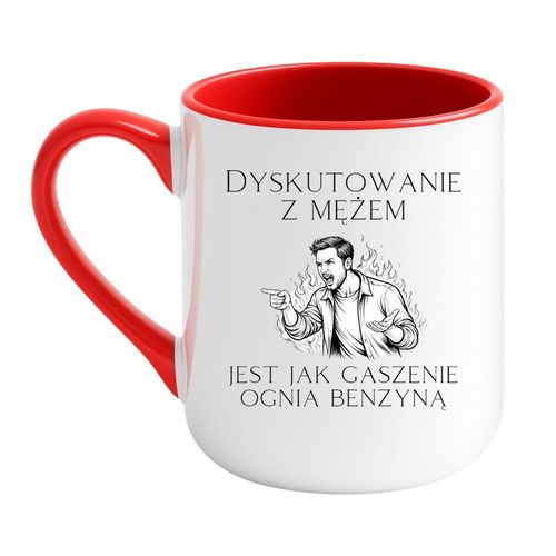 Kubek z napisem „Dyskutowanie z mężem jest jak gaszenie ognia benzyną” to ceramiczny kubek prezentowy dla osób, które lubią humor o relacjach, życiowe teksty i praktyczne gadżety z charakterem. Sprawdza się jako prezent dla żony, męża, partnerki, partnera albo jako żartobliwy upominek dla pary, która ma dystans do codziennych sprzeczek i lubi śmiać się z życia we dwoje. To model, który łączy codzienną użyteczność z czytelnym tekstem, mocną metaforą i grafiką wzmacniającą relacyjny przekaz.