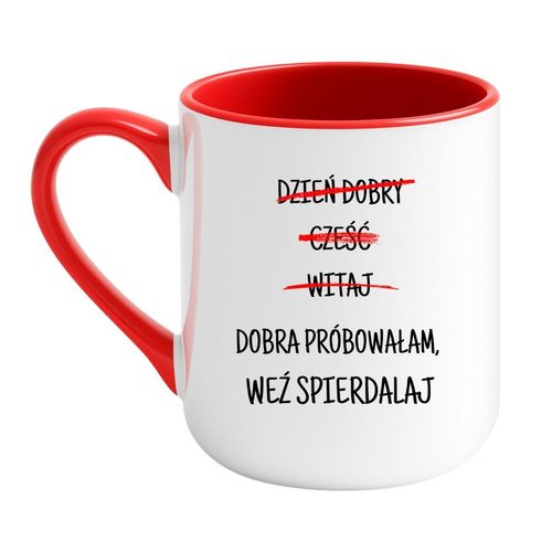 Kubek „Dzień dobry, cześć, witaj. Dobra próbowałam, weź spierdalaj.” to doskonały wybór dla osób, które nie mają czasu na udawanie, że wszystko jest ok. Jeśli poranek zaczynasz od wkurwienia i po prostu nie masz ochoty na zbędne rozmowy, ten kubek mówi za Ciebie. Idealny sposób, by jasno i dobitnie pokazać, że nie masz nastroju na nic poza swoją kawą.
