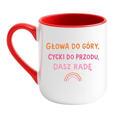 Jeśli szukasz prezentu, który naprawdę poprawia nastrój i wywołuje uśmiech 😌 zamów kubek „Głowa do góry, cycki do przodu, dasz radę”. To śmieszny kubek na prezent, który motywuje, wspiera i zostaje z obdarowaną na długo.