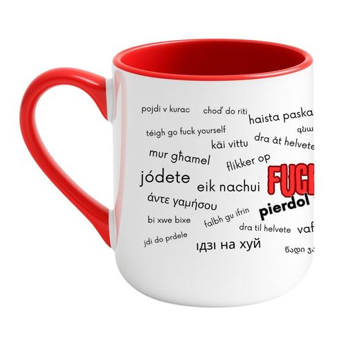 Choć przekaz jest mocny, kontekst decyduje o odbiorze. Ten kubek z napisem fuck you w różnych językach często wybierany jest jako:
