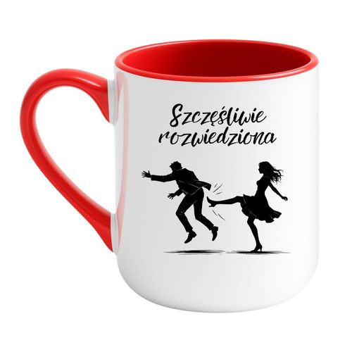 Kubek Szczęśliwie rozwiedziona to humorystyczny kubek dla rozwiedzionej kobiety, który symbolizuje nowy etap życia, niezależność oraz dystans do zakończonego małżeństwa.