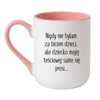 Kubek „Nigdy nie byłam za biciem dzieci, ale dziecko mojej teściowej samo się prosi” to doskonały wybór dla tych, którzy z dystansem podchodzą do relacji rodzinnych, szczególnie tych z teściami. Ten napis jest pełen humoru, który doskonale odzwierciedla sarkastyczne podejście do pewnych życiowych sytuacji. Z pewnością wywoła uśmiech na twarzy każdego, kto zna teściową i dzieci w rodzinie.