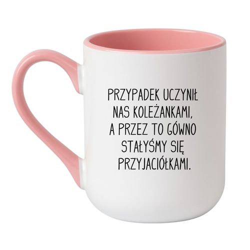 Kubek „Przypadek uczynił nas koleżankami, a przez to gówno stałyśmy się przyjaciółkami” to idealny wybór dla tych, którzy mają przyjaciółkę, z którą łączy ich nie tylko wspólny przypadek, ale również ogromna więź i mnóstwo wspólnych wspomnień. Z odrobiną humoru i szczerości, kubek ten jest świetnym przypomnieniem o tym, że prawdziwa przyjaźń to coś wyjątkowego, nawet jeśli zaczęło się od zupełnie przypadkowego spotkania.