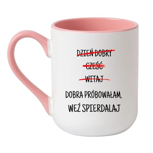 Kubek „Dzień dobry, cześć, witaj. Dobra próbowałam, weź spierdalaj.” to doskonały wybór dla osób, które nie mają czasu na udawanie, że wszystko jest ok. Jeśli poranek zaczynasz od wkurwienia i po prostu nie masz ochoty na zbędne rozmowy, ten kubek mówi za Ciebie. Idealny sposób, by jasno i dobitnie pokazać, że nie masz nastroju na nic poza swoją kawą.