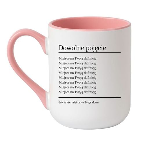 To kubek zaprojektowany w formie hasła i jego rozwinięcia — dokładnie tak, jak w słowniku. Na górze znajduje się wybrane pojęcie (np. imię), poniżej Twoja definicja w kilku linijkach, a całość utrzymana jest w minimalistycznym, eleganckim stylu.