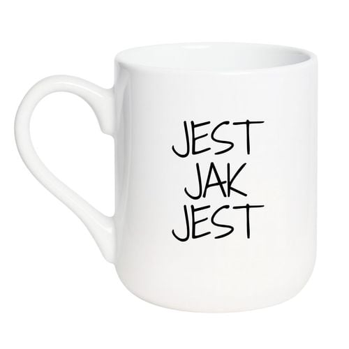Ten kubek działa, bo napis jest krótki, naturalny i bardzo rozpoznawalny. „Jest jak jest” nie próbuje na siłę rozśmieszać. To tekst, który brzmi jak prawdziwy komentarz do codzienności, dlatego łatwo zapada w pamięć i nie traci sensu po pierwszym użyciu.