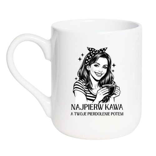Kubek bez cenzury „Najpierw kawa, a twoje pierdolenie potem” to śmieszny kubek dla kobiety, która kocha kawę, ma dystans do ludzi i lubi mocne teksty bez filtra. Ten wzór świetnie sprawdza się jako prezent dla niej z humorem, bo łączy bardzo życiową puentę z kobiecą grafiką i codzienną użytecznością. To kubek dla kawoszki, który od razu mówi wszystko: najpierw kofeina, potem cała reszta świata.