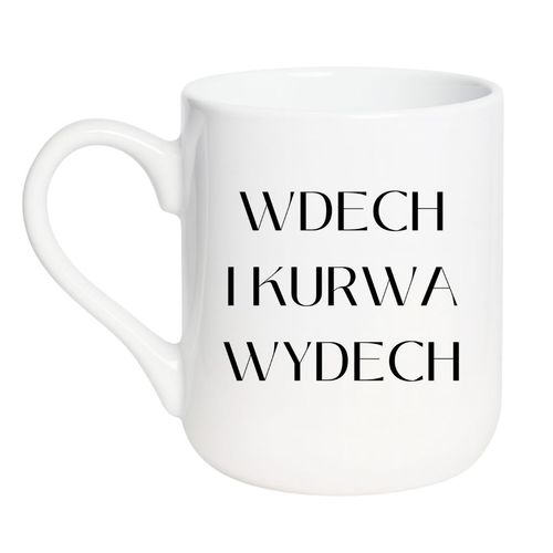 Śmieszny kubek z napisem Wdech i kurwa wydech przyciąga uwagę prostotą i natychmiastową czytelnością. To nie jest nadruk, który trzeba długo interpretować. To raczej krótki komunikat, który idealnie odnajduje się przy porannej kawie, na biurku w pracy albo w domu po cięższym dniu.
