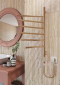 Elektryczny grzejnik łazienkowy Wertykal ze stali nierdzewnej o idealnie złoconej lustrzanej powierzchni ma 6 ruchomych przęseł, każde z których obraca się o 180° niezależnie od drugiego.