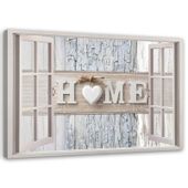 Emaga Obraz na płótnie, Napis Home w oknie - 60x40 to idealne rozwiązanie dla osób pragnących wprowadzić do swojego wnętrza odrobinę ciepła i charakteru. Ten unikalny obraz łączy w sobie nowoczesny design oraz wysoką jakość, co czynią go doskonałym dodatkiem do każdego pomieszczenia.